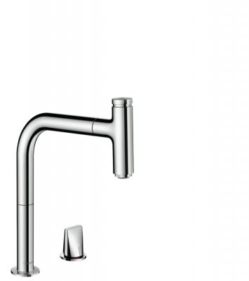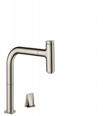 - Кухненски смесител с 2-отвора Metris Select M71, 200 2jet, с изтеглящ се чучур и sBox, Хром # 73818000, Надраскан черен хром # 73818340, Мат черен # 73818670, Неръждаема стомана # 73818800